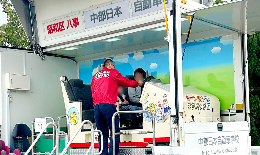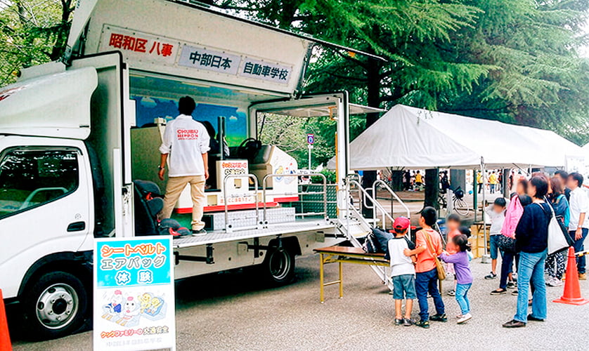 昭和区区民まつりなど、地域のお祭りやイベントに出展し、交通安全啓発活動を行っています。模擬衝突体験ができる車両で、事故の衝撃やシートベルト、エアバッグの重要性を感じていただける内容となっています。