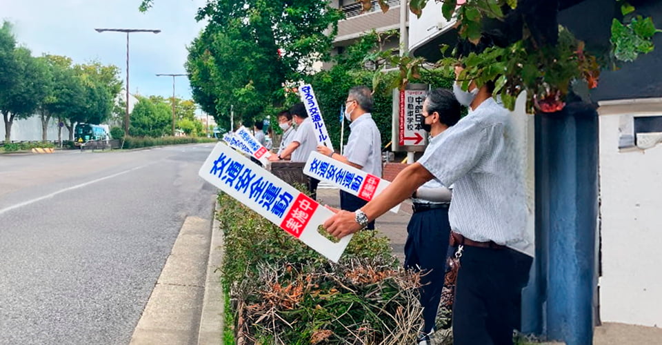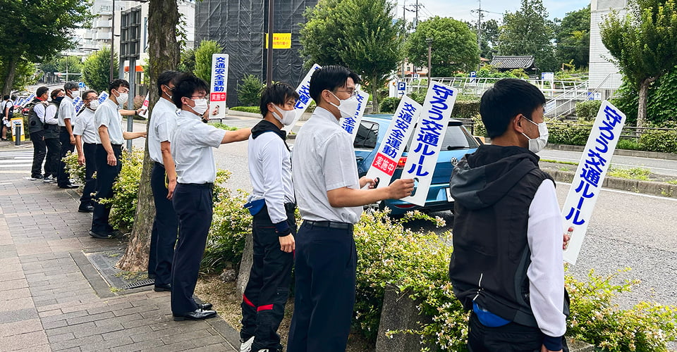 交通安全週間に合わせ年4回立哨活動を行っています。全社員が「交通事故ゼロ社会」を目指し、参加しています。